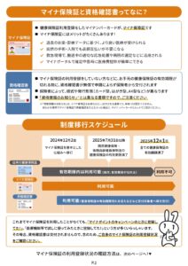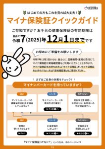 健康保険証の有効期限 2025/11/05 カテゴリー : 法改正・お知らせ 朝晩冷え込む日が増えてきましたね。 インフルエンザも流行っているようですので体調に気をつけてお過ごしください。 ところで、お手元の健康保険証が最長でも令和7年12月1日で使用できなくなることはご存知ですか? マイナンバーカードをまだ作っていない方やマイナンバーカードは作っているが健康保険証と紐づけていない方でも資格確認書が交付されているはずですので令和7年12月2日以降は資格確認書をご提示ください。