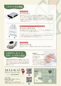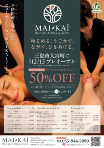 新規事業発足のご案内 ◤ビューティーサロン「MAI・KAi」◢ 2025/11/28 カテゴリー : お知らせ Triple Edgeのウェルネスカンパニーを創造するための行動の一環として、2025年12月15日、三島市大宮町にビューティサロン「MAI・KAi」をオープンする事となりました。 プレオープン中はお得なプランもご用意してますのでぜひお越しください。 ※MAI・KAiとは美しい・健康・元気を意味します※