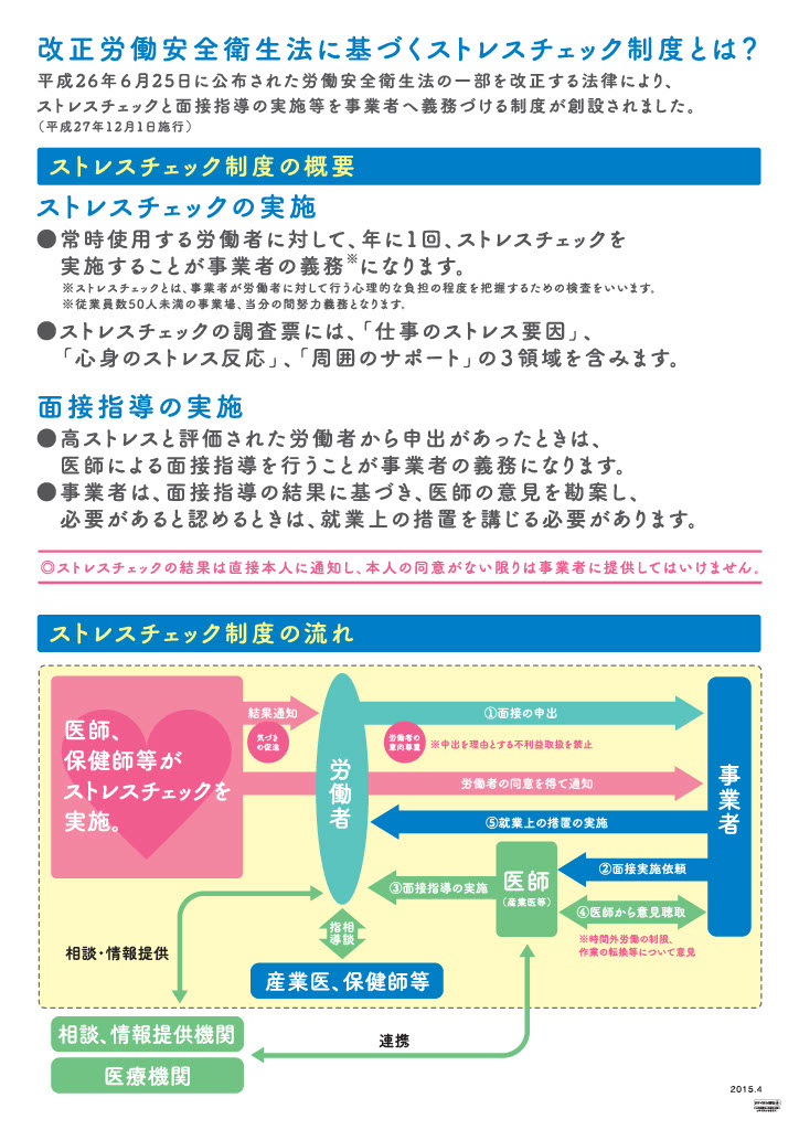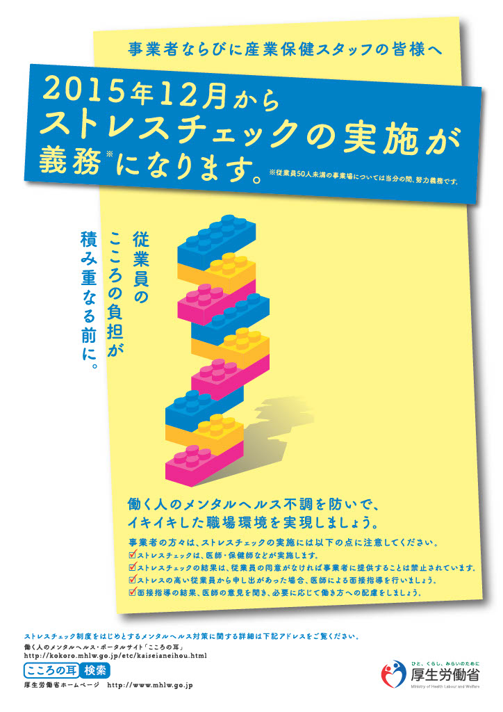 ストレスチェック制度 2026/02/13 カテゴリー : お知らせ ストレスチェック制度は、厚生労働省にて義務付けられている制度です。定期的に労働者のストレスの状況について検査を行い、本人にその結果を通知して自らのストレスの状況について気付きを促し、個人のメンタルヘルス不調のリスクを低減させるとともに、検査結果を集団的に分析し、職場環境の改善につなげることによって、労働者がメンタルヘルス不調になることを未然に防止することを主な目的としたものです。平成27年12月に施行されました。当社でも毎年行っております。